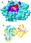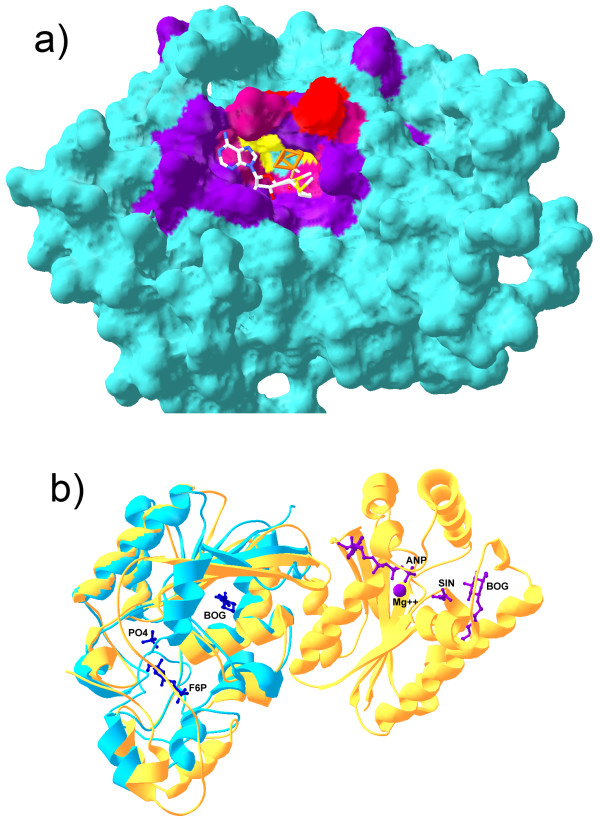 Figure 7. Binding sites predicted by SMID-BLAST. a) Shown is a comparative model of the predicted Elp3 domain of MiaB. The iron-sulfur cluster (orange) and SAM (CPK stick model) have had their co-ordinates transferred from the modelling template, PDB 1OLT chain A to illustrate how they might bind. The predicted Fe-S binding site residues are indicated in red, the predicted SAM binding residues are shown in purple, and the three cysteine residues which interact with the Fe-S cluster are indicated in yellow. A mixture of red and purple was used for residues common to both binding sites. b) Structural alignment of PDB 1RII chain A (phosphoglycerate mutase from M. tuberculosis, blue) and 2BIF chain A (6-phosphopructo-2-kinase/fructose-2,6-bisphosphatase from Rattus norvegicus, yellow). The small molecules from 2BIF are also shown along with their PDB short labels. Purple molecules associate with the N-terminal domain of 2BIF chain A, while blue molecules associate with the C-temrinal domain. Note that BOG was part of the crystallization buffer in this example. Structures were aligned with Swiss PDBViewer.