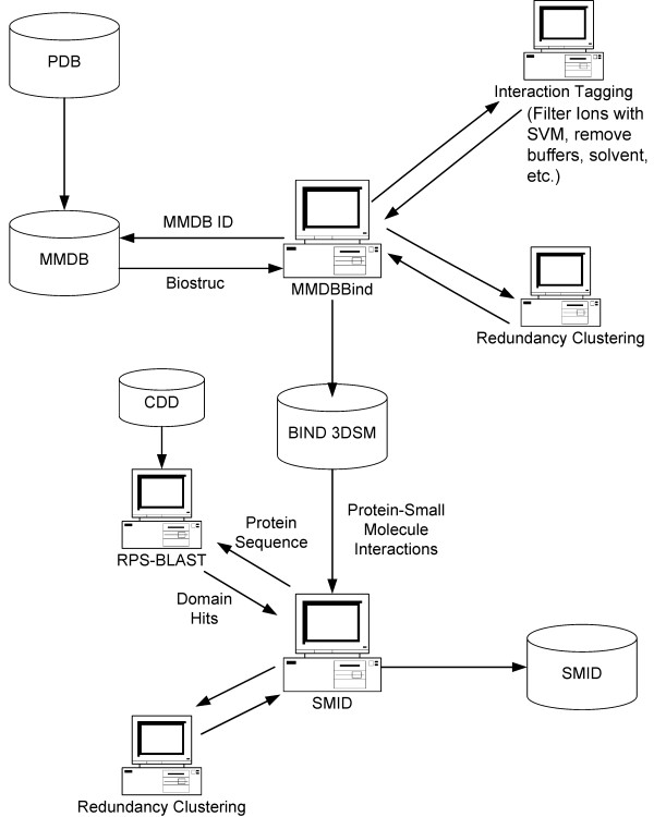 Figure 8. An overview of how protein-small molecule interactions are identified from the PDB and utilized to generate SMID records. The process of 'Interaction Tagging' involves the identification of protein-small molecule interactions that involve i) single atom contacts ii) an unknown protein sequence iii) a biologically irrelevant small molecule iv) false contacts with biologically relevant ions using a Support Vector Machine. See text for details.
