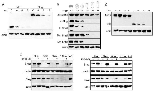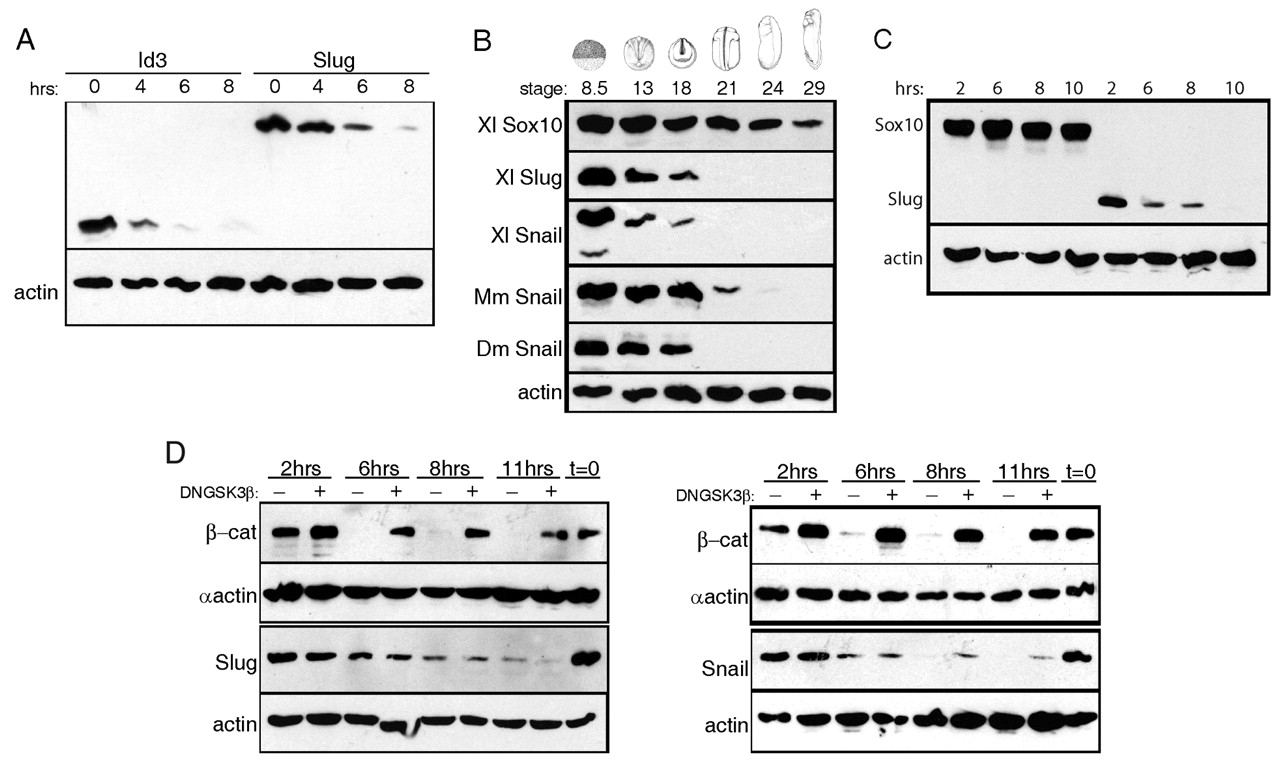 Fig 1. Slug is an unstable protein. (A) Embryos were injected with mRNA encoding either Slug or Id3, allowed to develop to stage 8 and treated with cycloheximide (CHX) to prevent further protein synthesis. Western blot analysis demonstrates that Slug protein is highly unstable and is regulated in a time frame similar to that of Id3. (B) The instability of Snail family members is evolutionarily conserved. Western blot showing that in contrast to Xl Sox10, expression of Xl Slug, Xl Snail, Mm Snail and Dm Snail is greatly diminished or undetectable by migrating neural crest stages. All blots were stripped and re-probed with actin as a loading control. Representative actin shown is for Slug blot. (C) Embryos injected with mRNA encoding either Sox10 or Slug were treated with CHX at stage 8. Western blot analysis demonstrates that Sox10 has a significantly longer half-life than Slug. (D) Embryos co-injected with DNGSK3β and eitherβ -catenin, Slug or Snail were treated with CHX at stage 8 and collected at the time points indicated. Whereas β-catenin was robustly stabilized by the presence of DNGSK3β, Snail was only modestly stabilized and Slug stability was not affected. Actin was used as a control.