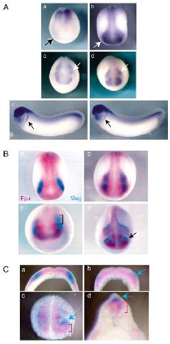 Fig. 4. Ppa is dynamically expressed in neural crest-forming regions. (A) In situ hybridization showing the developmental expression of Ppa at stage 13 (a) stage 16 (b) stage 19 (c), stage 22 (d) stage 24 (e) and stage 28 (f). Strong expression is seen in the neural crest region of late neural plate stage embryos (b,c, arrows) and in the migrating neural crest at tailbud stages (d-f, arrows). By contrast, no Ppa expression is seen in neural crest precursor-forming regions at stage 13 (a, arrow). (B) Double in situ hybridizations comparing the expression patterns of Ppa (pink) and Slug (light blue). At stages 15 (a) and 18 (b), Ppa and Slug expression is entirely overlapping. However, at stages 20 (c) and 22 (d), Ppa and Slug expression patterns are only partially coincident. Bracket in c indicates region of Slug-expressing cells that do not expess Ppa. Arrow in d indicates migratory neural crest cells that express Slug but not Ppa. (C) Vibratome sections of double in situ hybridizations demonstrate the complete colocalization of Ppa and Slug expression in the rostral region of a stage 15 embryo (a). A more caudal section from the same embryo as in a, showing that Ppa is not expressed in the newly induced, Slug-expressing neural crest precursors (b, arrow). Sections through cranial (c) and spinal cord (d) regions of a stage 24 embryo. Slug is expressed in the earliest migrating neural crest (c,d, arrow) but Ppa is excluded from these cells (c,d, bracket).