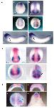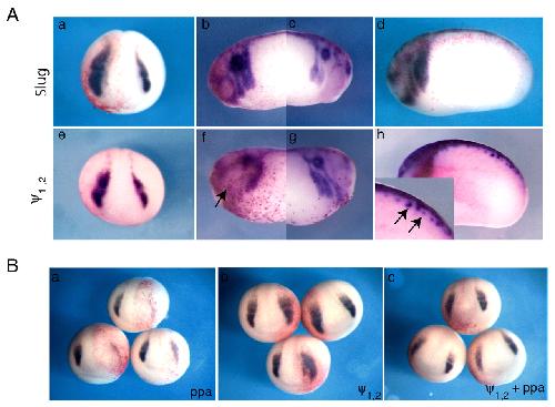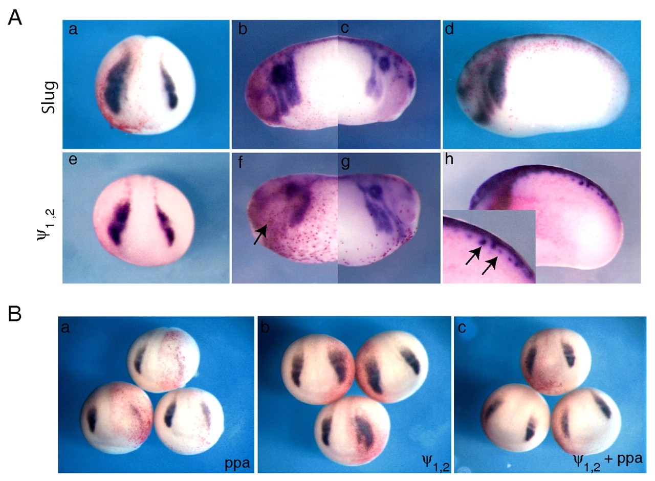 Fig. 8. A stabilized Slug mutant rescues neural crest formation in Ppa-injected embryos. (A) Embryos were injected with Slug (a-d) or SlugÏ1,2 (e-h), together with the lineage tracer nβ-gal (red) and in situ hybridization was used to analyze neural crest precursor formation and migration. Both Slug (a) and SlugÏ1,2 (e) expand Slug expression at stage 15. Slug overexpression increases the number of migratory neural crest cells at stage 24 (b, injected side; c, control side) whereas SlugÏ1,2 injection results in a clearing of Sox10-positive cells (f, injected side; g, control side). The presence of premature, ectopic migratory neural crest cells is observed in embryos overexpressing SlugÏ1,2 (h, inset) but not in embryos injected with Slug (d). (B) Embryos were injected in one of two cells with Ppa (a) SlugÏ1,2 (b) or Ppa and SlugÏ1,2 (c) along with the lineage tracer nβ-gal (red). Ppa prevents neural crest precursor formation (a), whereas SlugÏ1,2 expands this cell population (b), as assayed by Slug expression. Co-injection of SlugÏ1,2 with Ppa rescues neural crest precursor formation (c).