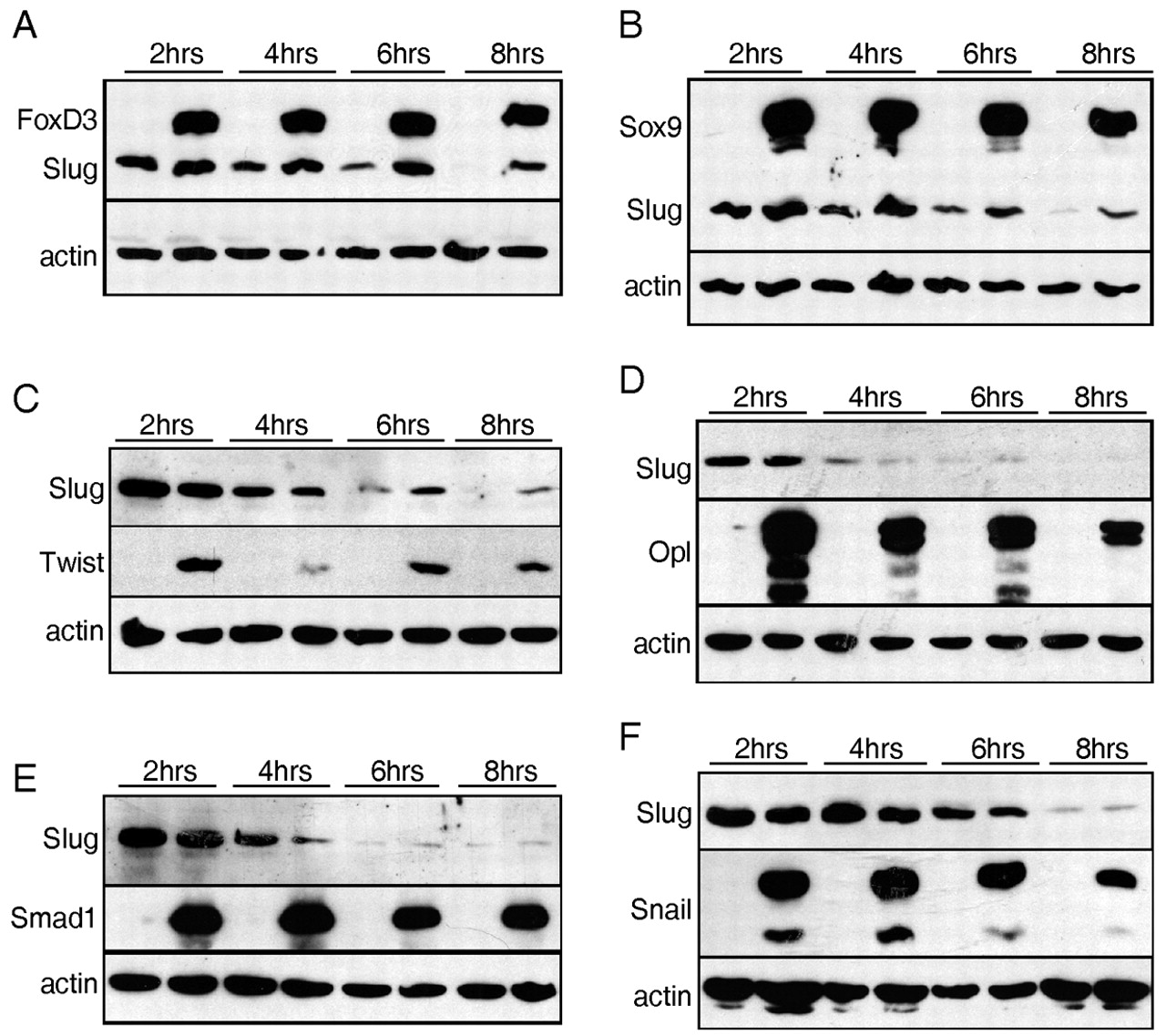 Fig 2. Slug stability is positively regulated by activation of the neural crest regulatory program. (A-F) Embryos were co-injected with Slug and either FoxD3 (A), Sox9 (B), Twist (C), Opl (D), Smad1 (E) or Snail (F) and treated with CHX at stage 8 to prevent further protein synthesis. Samples collected at the time points indicated were subjected to western blot analysis. FoxD3, Sox9, and Twist all increased Slug stability, whereas Smad1, Snail and Opl were unable to do so. Actin was used as a control.