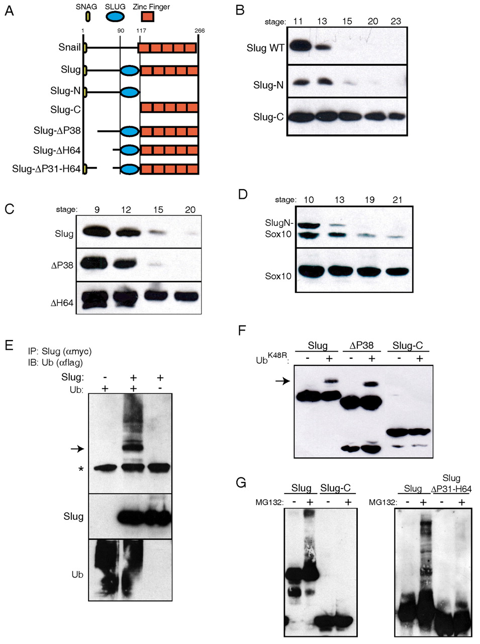 Fig 3. Sequences within the N terminus of Slug are responsible for its ubiquitin-mediated proteasomal degradation. (A) Schematic illustrating the mutant constructs used in these experiments. (B) Western blot demonstrating that the C-terminal zinc fingers of Slug are highly stable, but the stability of the N terminus is comparable to that of the intact protein. (C) Western blot analysis was used to monitor the relative stability of Slug with a series of Slug deletion mutants. When compared to the full-length protein, the stability of ΔP38 was unchanged but the ΔH64 mutant was greatly stabilized. (D) Western blot comparing the stability of Sox10 and a Slug N-Sox10 fusion protein. Addition of amino acids M1-L63 of Slug to Sox10 was sufficient to render it unstable (double bands represent a partial degradation product). (E) Poly-ubiquitinated forms of Slug were immunoprecipitated from lysates of embryos co-injected with tagged forms of Slug and ubiquitin. Slug is indicated by an arrow. In all blots an asterisk indicates IgG background band. (F) Embryos were co-injected with a mutant form of Ub (UbK48R) and either Slug, ΔP38, or Slug-C and collected for western blot analysis. Whereas Slug and the unstable deletion mutantΔ P38 both incorporate UbK48R (arrow), the stable C-terminal zinc fingers do not. (G) Western blot demonstrating the accumulation of higher molecular mass forms of wild-type Slug, but not the Slug-C or SlugΔ P31-H64 deletion mutants, in response to treatment with the proteasomal inhibitor, MG132.