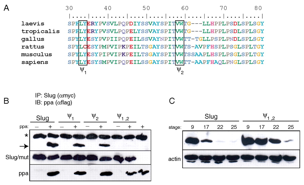 Point mutations in a hydrophobic rich region of the Slug N terminus prevents interaction with Ppa and stabilizes the protein. A) Alignment showing the conserved hydrophobic stretch of amino acids found in Slug proteins. laevis, Xenopus laevis; tropicalis; Xenopus tropicalis; gallus, Gallus gallus; rattus, Rattus rattus; musculus, Mus musculus; sapiens, Homo sapiens. (B) Wild-type Slug, or Slug in which target hydrophobic amino acids had been mutated (LY33, 34 VW58, 59 AA) were assayed in co-IP experiments for interaction with Ppa. Whereas Slug, Slugψ1 and Slugψ2 can efficiently bind Ppa (arrow), the combined mutant (Slugψ1,2) no longer interacts (* indicates IgG background band). (C) Embryos injected with wild-type Slug or Slugψ1,2 were collected at the stages indicated. Western blots from injected embryo lysates demonstrate that Slugψ1,2 is significantly more stable than is wild-type Slug.