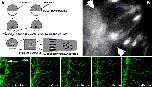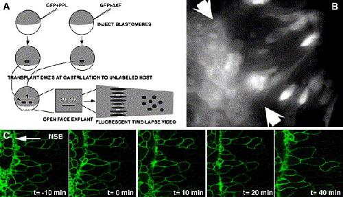 Fig. 3. Effect of deltaXF expression and CB1 peptide on cell behavior. (A and B) Genetic mosaic transplantation analysis of deltaXF-expressing cells reveals that deltaXF expression perturbs notochordal cell behaviors. (A) Embryos injected with either GFP and deltaXF or GFP and pre-prolactin were used to make DIMZ explants, and two small groups of expressing cells, one from each type of injected embryo, were transplanted above the dorsal lip of a single host embryo at midgastrulation. After healing, the DIMZ of this host embryo was explanted into culture and the labeled control and experimentally injected cells were observed during extension. (B) A single frame from a movie showing morphology of GFP labeled, transplanted control cells (injected with pre-prolactin + GFP; right of arrows) or experimentally injected (deltaXF + GFP; left of arrows) cells in an extending explant. Cells that exhibit an elongate morphology fit the profile of an MIB-expressing cell, and most control cells have length-to-width ratios greater than 2, in contrast to deltaXF-expressing cells in the same explant. In addition, note that the experimentally injected graft has maintained its cohesion during extension of the host explant, in contrast to the control injected graft which has been broken up through the process of intercalation to generate intermixed labeled and unlabeled cells. This serves as a positive control for this experiment, indicating that the grafted cells can participate in morphogenesis. (C) CB-1 peptide does not affect notochordal cell behavior. Time-lapse frames visualizing notochordal cell behavior in an axial explant undergoing morphogenesis to which CB-1 peptide is added at 50 μg/ml at frame t = 0. In contrast to deltaXF expression above, notochordal cell behavior is not affected by acute application of the CB-1 peptide.