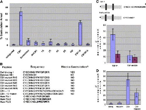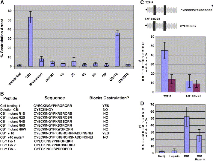 Fig. 5. Functionally defining the CB-1 domain responsible of perturbing gastrulation. (A) Percent of gastrulation arrested embryos is plotted with SEM from at least three experiments for uninjected embryos (n = 273), or injected with CB-1 peptide (n = 205), scrambled peptide (n = 272), deletion CB1 peptide (n = 84), CB1M1S (n = 68), CB1M2S (n = 76), CB1M4S (n = 58), CB1M6S (n = 74). CB1M6W (n = 72), CB1 + 10 (n = 139), CB1M10 (n = 50). (B) Table of sequences of injected peptides. Mutations from CB-1 sequences are shown in bold. (C) Injection of an mRNA encoding a deletion mutant of the TXF-P construct that lacks a functional CB-1 domain does not perturb gastrulation. Domain structure key is as in Fig. 1. Injection of TXF-P on the dorsal (n = 40) but not ventral (n = 43) side of the embryo causes gastrulation arrest. In contrast, expressing an eight amino acid deletion variant, TXF-delCB1, does not cause gastrulation arrest when injected dorsally (n = 42) or ventrally (n = 34). (D) The gastrulation arrest phenotype of the CB1 peptide is heparin sensitive. Failure of blastopore closure is plotted for uninjected embryos (n = 75), embryos injected with 30 nl of 200 μg/ml heparin (n = 66), injected with 30 nl of 10 mg/ml CB-1 (300 ng) peptide (n = 80) or injected with CB-1 peptide (300 ng) preincubated with 200 μg/ml heparin (n = 81).