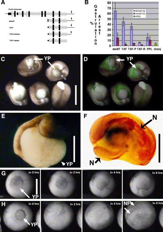 Fig. 1. deltaXF/TdXF expression perturbs gastrulation. (A) Schematic outline of the domain structure of the prototypical fibrillin and the injection constructs: deletion XF (deltaXF), twice-deleted XF(TdXF) (similar to deltaXF but with a partial EGF repeat removed) and two carboxy-terminal deletions of TdXF, TdXF-Protease (TdXF-P) and TdXF-Repeats (TdXF-R). Shown are calcium binding EGF-like repeats (gray ovals), EGF-like repeats (black ovals), 8-cysteine repeats (black rectangles), hybrid repeats between EGF-like and 8-cysteine repeats (gray rectangles) unique sequences (lines and gray box), N-cad signal sequences (black oval and pentagonârepresenting two distinct fusion sites between signal sequence and XF sequence) and furin processing site (arrow). (B) Percent of embryos exhibiting open blastopores is plotted with SEM for presumptive dorsal vs. ventral mesoderm injection of deltaXF (D, n = 56; V, n = 49), TdXF (D, n = 77; V, n = 80), TdXF-P (D, n = 71; V, n = 71), TdXF-R (D, n = 75; V, n = 59), pre-prolactin (PPL) (D, n = 47; V, n = 44) or uninjected embryos (n = 195). (C) DeltaXF dorsally injected late gastrula embryos exhibiting failure of blastopore closure and partial exogastrulation. Scale bars are 0.5Â mm in panels CâH. (D) The same embryos as in panel C, but visualizing co-injected GFP to reveal the dorsal targeting of these injections. (E) Dorsal deltaXF-injected St 22 embryo exhibiting open blastopore. (F) deltaXF-injected embryo stained for a notochord marker (Tor70), which reveals notochord (N) ringing the yolk plug. (G and H) Frames from movies of developing embryos injected with (G) TdXF or (H) PPL with elapsed time indicated. YP = yolk plug; n = notochord; NF = neural folds.