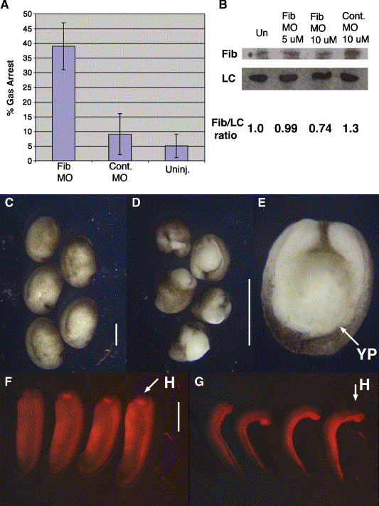 Fig. 6. XF morpholino perturbs gastrulation. Reducing XF translation in embryos blocks the normal progression of gastrulation. (A) Percent of gastrulation arrested embryos is plotted with SEM for XF morpholino (n = 93), control MO (n = 88) or uninjected embryos (n = 94). (B) Western blot for XF reveals XF morpholino injection results in a partial knockdown of XF protein levels, when normalized against a loading control (LC). (C) Embryos injected with 10 μM 5-misprime XF control morpholino develop normally. (D and E) Embryos injected with 10 μM XF MO exhibit open blastopores. (F) Embryos unilaterally injected with 10 μM 5-misprime control morpholino do not bend. (G) Embryos injected with 10 μM XF morpholino bend towards the injected side. H = head; YP = yolk plug.