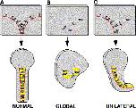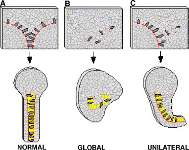Fig. 7. Model for function of Xenopus fibrillin in convergence and extension, and consequences for morphogenesis of perturbing XF globally and unilaterally. All panels show an open face DIMZ explant before and after autonomous extension. For each, extension is downward (posterior) with yellow representing notochord and red lines indicating the location of the presumptive notochordalâsomitic boundary (upper panels), or the localization of XF in the mature, matrix-rich notochordalâsomitic boundary (lower panels). (A) In normal open face DIMZ explants cells (open circles) are induced to become bilaterally protrusive and elongate (exhibit MIB), bind to the XF containing notochordâsomite boundary, where they exhibit local inhibition of protrusion. These cells then converge towards the midline, dragging the boundary with them and causing directed extension of the notochord (shown in the extended explant). In this model XF at the boundary functions in the process of directing extension posteriorly and may function in regulating cell motility at the boundary. (B) In explants in which XF deposition at the boundary is globally perturbed, either by expressing deltaXF widely or injecting the CB-1 peptide, fibrillin fibril localization to both of the bilateral boundaries is disrupted. This leads to twisted notochords as extension is no longer globally directed in the posterior direction, and in whole embryo experiments leads to failure of blastopore closure. (C) In explants in which XF is compromised unilaterally bending occurs, again suggesting that XF fibrils normally function to direct extension posteriorly.