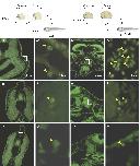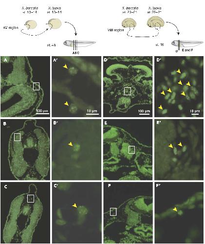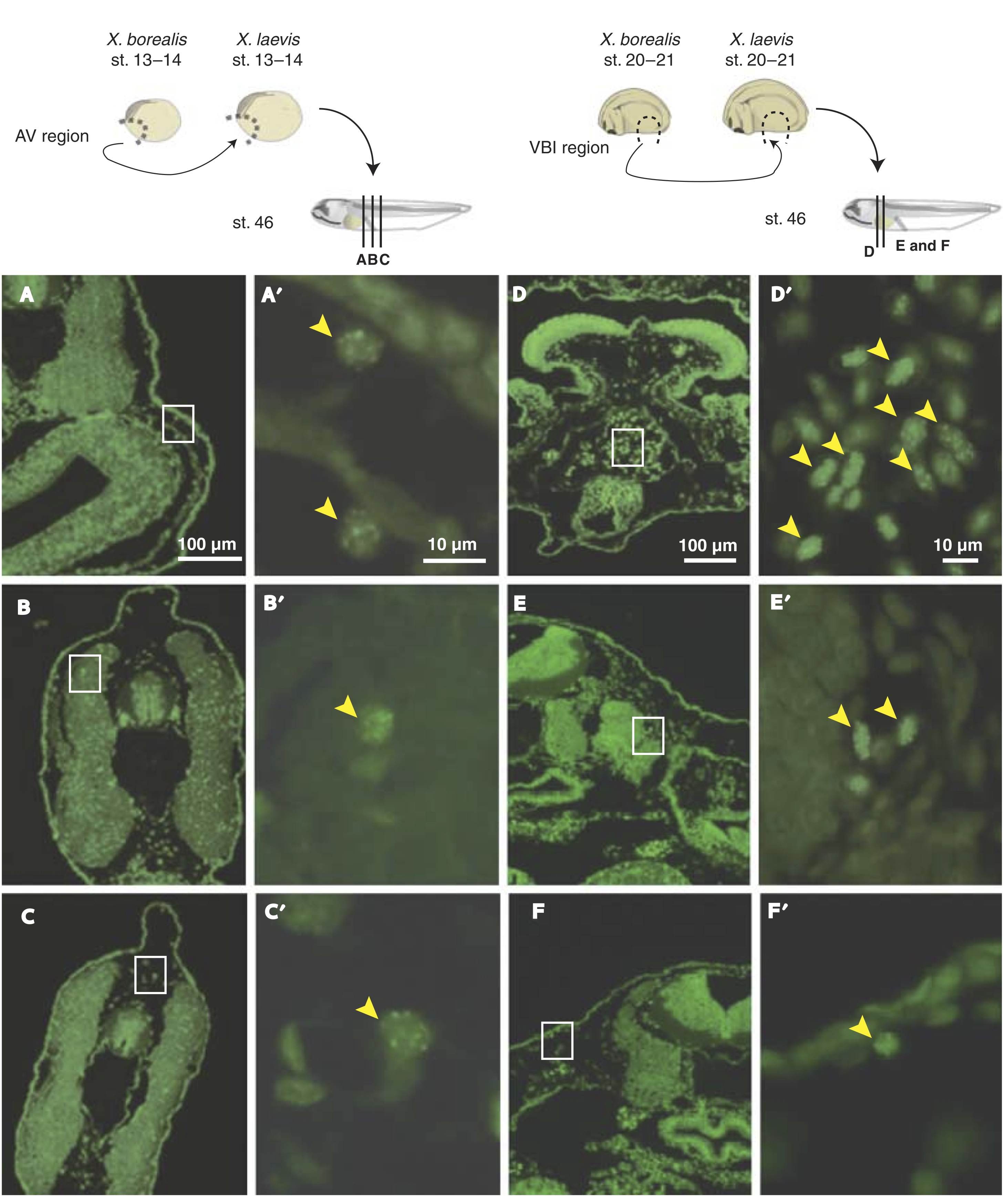 Fig. 3. Distribution of anterior ventral (AV)- and ventral blood island (VBI)-derived cells in the mesenchyme and peripheral blood at the early tadpole stage. The AV regions of Xenopus borealis embryos at stage 13â14 were excised and orthotopically transplanted into Xenopus laevis embryos. As a control experiment, the VBI regions of borealis embryos at stage 20â21 were transplanted. The host embryos were allowed to develop until appropriate stages and were fixed for histological examination to detect borealis (donor) cells. (AâF) Quinacrine-stained sections of AV-grafted animals (AâC) and VBI-grafted animals (DâF) at stage 46. AââFâ are high magnification views of AâF. Borealis nuclei have brightly stained spots after staining with quinacrine (arrowheads in AââFâ). Significant numbers of borealis cells were observed in the mesenchyme near the epidermis (A, Aâ), the spinal cord (C, Câ) and in the somite (B, Bâ) of AV-grafted animals. In contrast, many borealis cells were observed in the heart (D, Dâ), blood vessels (E, Eâ) and mesenchyme (F, Fâ) of VBI-grafted animals.