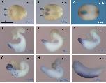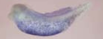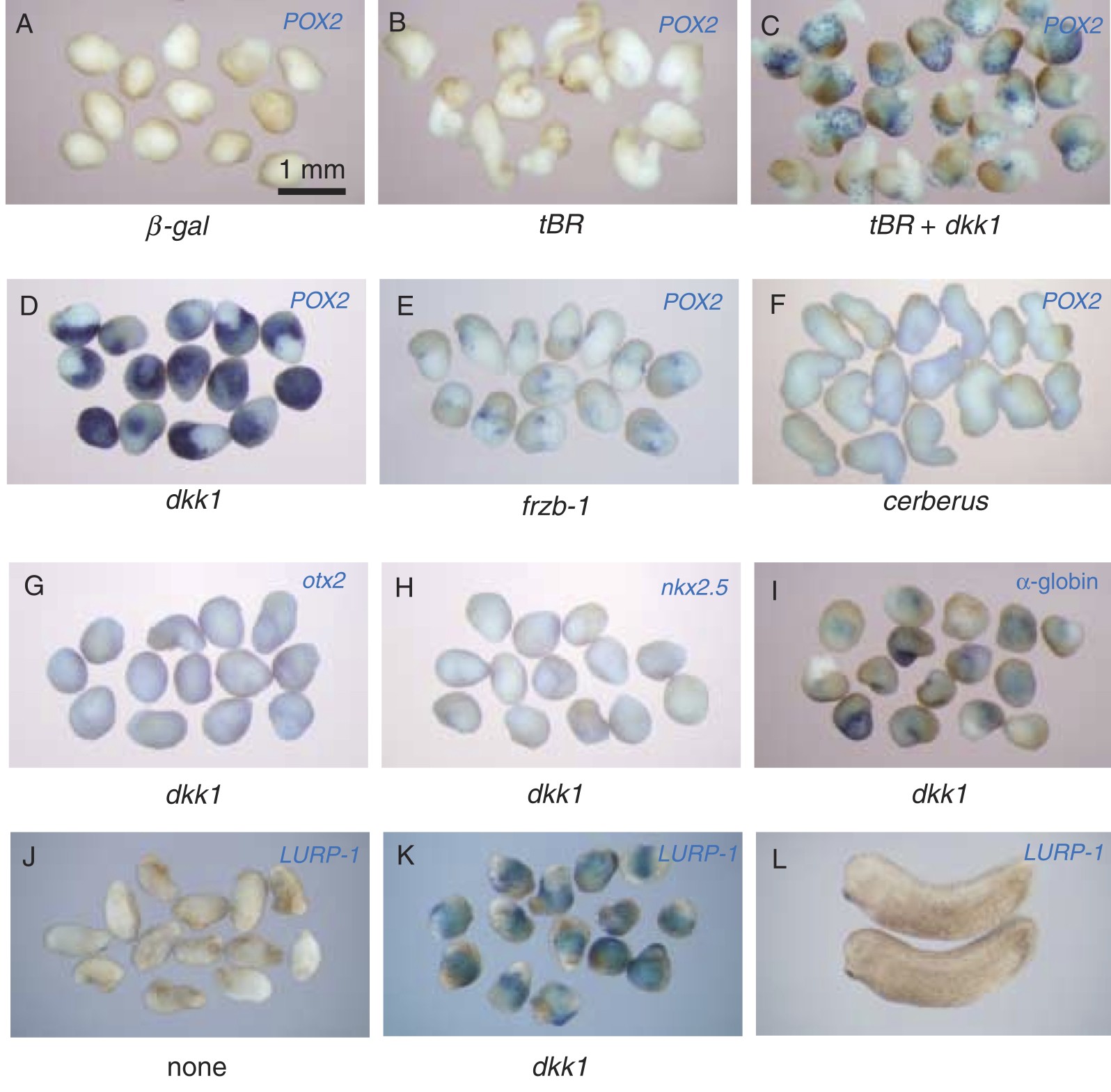 Fig.5. Induction of peroxidase 2 (POX2) expression in ventral marginal zone (VMZ) explants. Prospective VMZ at the 4-cell stage injected with mRNA coding for the BMP signal inhibitor and/or the wnt signal inhibitors. VMZ explants excised at the early gastrula stage were cultured until stage 28–30 and processed for whole-mount in situ hybridization analysis. Expression of POX2 (A–F), nkx2.5 (G), otx2 (H), α-globin (I) and LuRP (J, K) was examined in cultured VMZ explants that had been previously injected with β-gal (300 pg) (A), tBR (1000 pg) (B), tBR (1000 pg) + dkk1 (50 pg) (C), dkk1 (50 pg) (D, G, H, I, K), frzb-1 (800 pg) (E), or cerberus (600 pg) (F) mRNA. POX2 was strongly induced by dkk1 mRNA but was not induced by tBR mRNA. The VMZ explants injected with dkk1 mRNA did not express other anterior tissue markers, such as otx2 or nkx2.5. Instead, they expressed a ventral mesoderm marker, such as α- globin. Another leukocyte marker, LURP-1, was also strongly induced by dkk1 mRNA injection (50 pg) (J, K). L shows the expression of LURP-1 in stage 30 embryos.