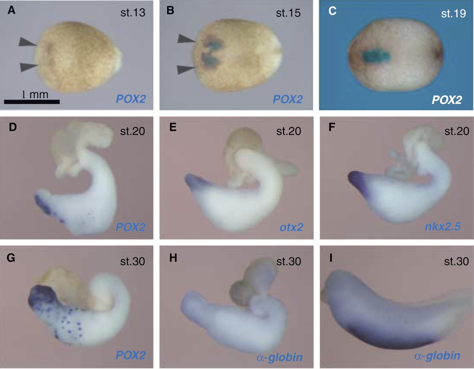 Fig. 1. Expression of peroxidase 2 (POX2) in normal and exogastrula embryos (A–C). Whole-mount in situ hybridization analysis at the neurula stage (stage 13 and stage 15) (A and B) and early tailbud stage (stage 19) (C), showing that expression of POX2 starts in the two separated portions of the anterior ventral region (arrowheads in 1A and 1B). (D–I) Expression of POX2 (D, G), otx2 (E), nkx2.5 (F) and α-globin (H) in exogastrula embryos. The exogastula embryos were made as described in the Materials and methods section, and these embryos were cultured until stage 20 (D, E, F) or stage 30 (G, H). The expression of α-globin in a control stage 30 embryo is shown in I. The POX2 message was localized in the anterior mesoderm where otx-2 and nkx2.5 were also located.