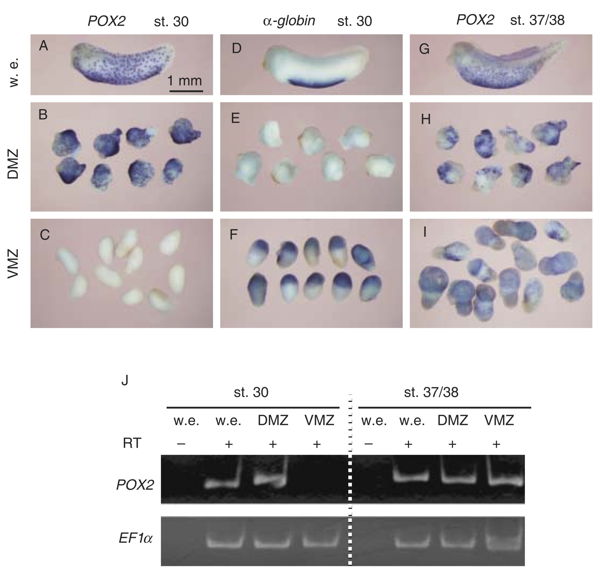 Fig. 4. Expression of peroxidase 2 (POX2) in dorsal marginal zone (DMZ) and ventral marginal zone (VMZ) explants. (A–I) Whole-mount in situ hybridization analysis showing the expression of POX2 (B, C, H, I) and α-globin (E, F) in DMZ (B, E, H) and VMZ (C, F, I) explants. Explants were harvested at stage 30 (B, C, E, F) or at stage 37/38 (H, I). Control whole embryos (w. e) are also shown (A, D, G). (J) Reverse transcription-polymerase chain reaction (RT-PCR) analysis. Explants and the control whole embryos (w. e) were harvested at stage 30 or stage 37/38 and processed for the RT-PCR analysis to show the expression of POX2 and EF1α. The results demonstrated that both the DMZ and VMZ explants contain leukocyte precursor cells, but only the cells in DMZ explants differentiate at the early stage (stage 30).