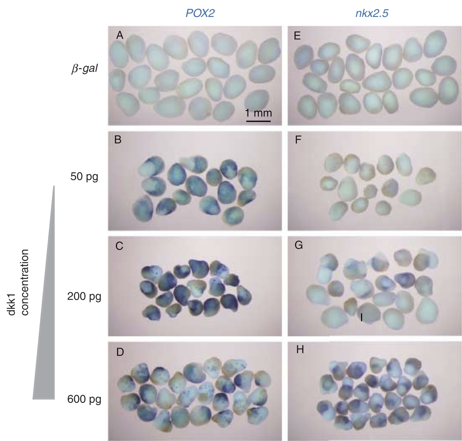 Fig.6. Dose-dependent induc- tion of peroxidase 2 (POX2) and nkx2.5 in ventral marginal zone (VMZ) explants after injection of dkk1 mRNA. Prospective VMZ at the 4-cell stage injected with dkk1 mRNA. VMZ explants excised at the early gastrula stage were cultured until stage 28 and processed for whole-mount in situ hybridization analysis. Expression of POX2 (A–D) and nkx2.5 (E-H) was examined in cultured VMZ explants that had been injected with 300 pg β-gal (A, E), 50 pg dkk1 (B, F), 200 pg dkk1 (C, G) or 600 pg dkk1 (D, H) mRNA. Expression of POX2 was induced at a low dose of dkk1 RNA, whereas nkx2.5 was induced at a high dose of dkk1 RNA.