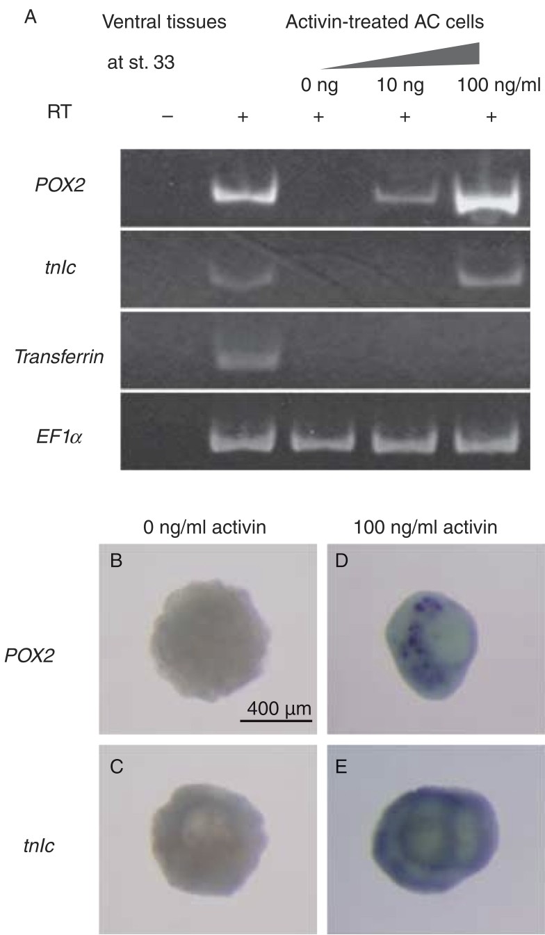 Induction of peroxidase 2 (POX2) in animal cap explants. The animal cap was excised from a mid-blastula embryo, and cells were dissociated in a Ca2+-free medium for 20 min and then reaggregated in the medium containing activin, as described previously (Ariizumi et al. 2003). Aggregates were further cultured until stage 33 and fixed to process for reverse transcription-polymerase chain reaction (RT-PCR) and whole- mount in situ hybridization analyses. (A) Expression of POX2, tnIc (a heart marker), transferrin (a liver marker) and EF1α (loading control) was examined by RT-PCR analysis. POX2 expression was strongly induced in the explants treated with 100 ng/mL activin. The explants also expressed tnIc but did not express transferrin. (B–E) Expression of POX2 and tnIc was examined by whole-mount in situ hybridization analysis.