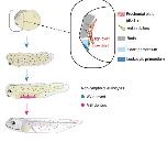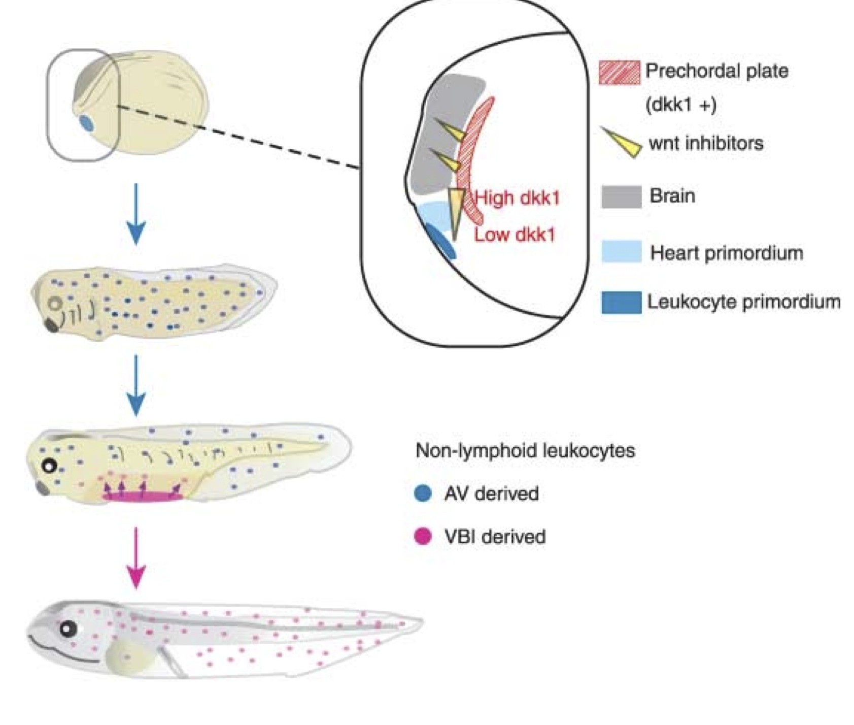 Fig. 8. Induction and distribution of myeloid cells derived from the anterior ventral (AV) region of the neurula embryo. At the early neurula stage wnt inhibitors, such as dkk1, frzb-1 and crescent, were expressed in the prechordal plate and anterior endoderm (diagonal area). A high dose of dkk1 induces the heart mesoderm, while a low dose of dkk1 induces myeloid cells. The differentiated leukocytes start to migrate toward the posterior area at the tailbud stage. At the swimming tadpole stage, ventral blood island (VBI)- derived leukocytes appear, in addition to AV-derived leukocytes, and the former become a major population at the feeding tadpole stage.