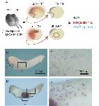 Distribution of anterior ventral (AV)-derived cells and dorsal marginal zone (DMZ)-derived cells in the embryos at the tailbud stage. (A) Beta-galactosidase (beta-gal) RNA (300 pg/embryo) was injected into the DMZ at the 4-cell stage. AV region at stage 13–14 or DMZ at stage 10+ was excised from the beta-gal-injected embryos and transplanted into stage 13–14 embryos. Host embryos were fixed at the tailbud stage (stage 32), stained with red-gal and subjected to whole-mount in situ hybridization analysis. A tailbud embryo (B, C) grafted with AV region (asterisk in B) and a tailbud embryo (D, E) grafted with DMZ region (asterisk in D), showing red-gal-positive cells (red) and peroxidase 2 (POX2)-positive cells (blue). Existence of double- positive cells (purple cells in C and E) in the lateral trunk region of the embryo revealed that a group of cells derived from the transplanted area migrated in the posterior direction and differentiated into POX2-positive leukocytes.