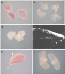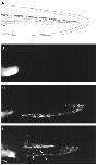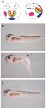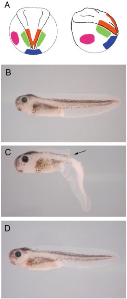 Fig. 2. Role of the neural crest. A: Schematic of neurulaembryo stage 13. Dorsal and side view. Red areas represent the posterior neural crest ablated in C. Green areas represent the posterior dorsal finepidermis ablated in D. Blue areas represent the ventral region. Pink areas represent the lateral region. B: Control embryo stage 41. C: Ablation of the posterior neural crest at stage 13. Embryo cultured to stage 41. Embryo shows loss of the dorsal fin from arrow, except at the very tip. The ventralfin remains unaffected. D: Ablation of the dorsal finepidermis at stage 13. Embryos cultured to stage 41. No fin defect is observed. n 35 for C, n 30 for D.