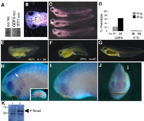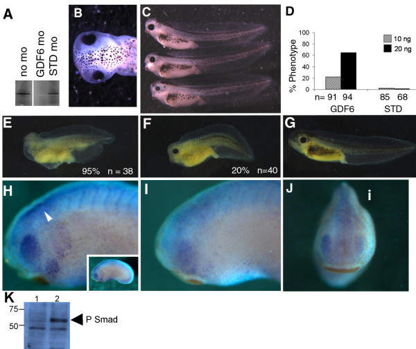Figure 1. Reduced eye size following GDF6 depletion. (A) In vitro translation of GDF6 mRNA is blocked by GDF6 MOrpholino (GDF6 MO) but is not affected by the standard control MOrpholino (STD MO). (B) Dorsal view of stage 41 tadpole injected with 10 ng GDF6 MO on the left side. (C) Lateral view of tadpoles showing (top to bottom) an unaffected tadpole; GDF6 MO injected sides with an eye 84% of normal contra lateral size and 66% of normal contra lateral size. (D) Graphical representation of the percent of embryos injected with GDF6 MO with the small eye phenotype at stage 41 compared with those injected with STD MO. (E) A severely ventralized embryo injected with 250 pg GDF6 mRNA at stage 41. The percent of ventralized embryos is shown. (F) An example of a partially rescued embryo injected with 250 pg GDF6 mRNA + 20 ng GDF6 MO. The percent of similarly ventralized embryos is shown. (G) A completely rescued embryo injected with 250 pg GDF6 mRNA + 20 ng GDF6 MO. (H) The untreated side of a stage 24 embryo immunostained with anti-phosphorylated-Smad1/5/8 showing staining within the retina and along the neural tube (arrow). Full embryo is shown in the inset. (I) The GDF6 MO (20 ng) injected side of the same embryo showing a loss of phosphorylated-Smad1/5/8 in the retina and neural tube. (J) Frontal view of the same stage 24 embryo showing the reduction in the intensity of the phosphorylated-Smad1/5/8 stain on the injected side (i). (K) Endogenous Smad1/5/8 phosphorylation in St.11.5â12.5 embryonic extracts, lane 2. No Smad phosphorylation is detected in 64 cell embryos lane 1.