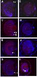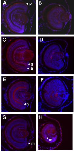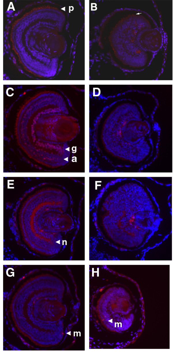 Figure 2. Loss of retinal differentiation and laminar structure in GDF6 depleted embryos. Histology of stage 41 embryos with small eyes following GDF6 MO injection (20 ng) compared with normal stage matched controls. DAPI staining of small eye (B, D, F, and H) compared with normal eye (A, C, E, and G) showing small eyes have a lack of laminar structure and appear disorganized. (A, B) Photoreceptors (p) are not stained in B compared with XAP-1 staining in A. (B) Cell bodies are visibly extending outward (white arrow) but do not stain for XAP-1. Red staining next to the lens is non-specific staining also detected in a proportion of negative controls. (C, D) 40.2D6 detects ganglion (g) and amacrine (a) cells within the normal retina, but these cells are not detected in the small eye. Photoreceptors are visible due to autofluorescence at increased exposure. (E, F) Small disorganized eyes show a loss of immunostaining for the cytoplasmic domain of NCAM (n). (G, H) Mitotic cells (m) detected using anti-phosphorylated-histoneH3 are few and found mainly in the ciliary marginal zone in normal stage 41 embryos. The small eye shows a few mitotic cells near the RPE layer.
