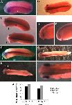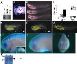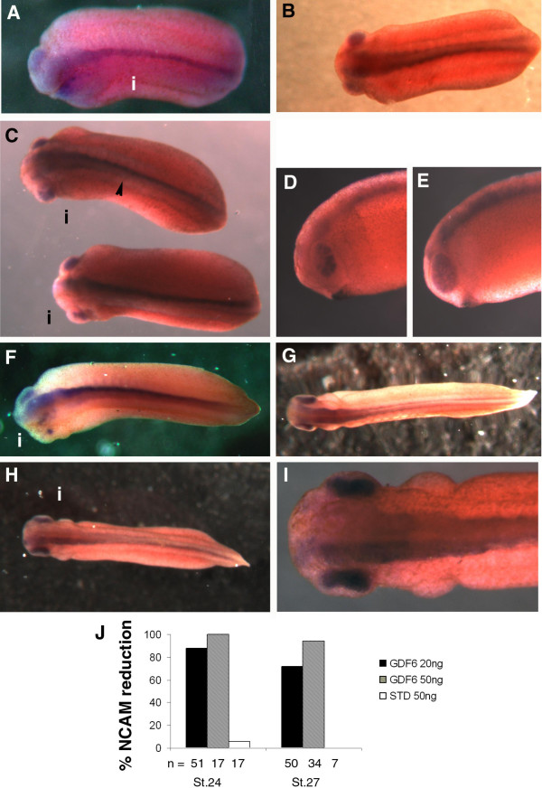 Figure 4. GDF6 knockdown disrupts neural differentiation. At neurulation stages, immunostaining for neural cell adhesion molecule (NCAM) is lost or reduced in intensity in the GDF6 MO injected side: A(i), C(i), D, F(i), H(i), I. (A) Stage 24 embryo injected with 50 ng GDF6 MO showing complete loss of NCAM stain along the neural tube on the injected side. Some patchy retina stain remains. This embryo is also curved and appears to be reduced in size on the injected side. (B) Normal NCAM stain in an embryo injected with 50 ng standard MO. (C) Stage 24 embryos injected with 20 ng GDF6 MO with NCAM stain lost along the posterior neural tube (top embryo, arrow marks posterior end of NCAM stain), or along the entire neural tube (bottom embryo). (D, E) Injected (D) and uninjected side (E) of bottom embryo in (C) showing patchy loss of NCAM stain in the retina of the injected side. (F) Dorsal view of stage 27 embryo injected with 50 ng GDF6 MO. The injected side (i) shows a loss of NCAM stain both along the neural tube and within the head and retina. In the head and retina small patches of intense NCAM staining remain. (G) Normal NCAM staining in a stage 27 embryo injected with 50 ng standard MO. (H, I) Full view and close up of a stage 27 embryo injected with 20 ng GDF6 MO. Neural tube NCAM staining is less intense on the injected side (top half of embryo). (J) Percent embryos with NCAM reduction on the injected side following GDF6 MO injection.
