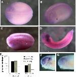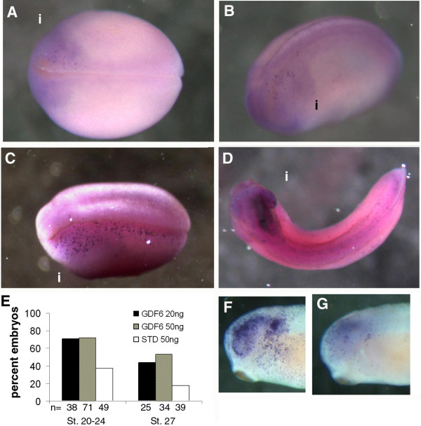 Figure 5. Increased cell death during neurogenesis in GDF6 depleted embryos. (A) Stage 20 embryo injected with 20 ng GDF6 MO shows a patch of TUNEL at the anterior region of the injected side (i). (B) Stage 22 embryo injected with 20 ng GDF6 MO showing TUNEL positive cells near the midline at the anterior region of the injected side (i). (C) Stage 22 embryo injected with 50 ng GDF6 MO showing more extensive TUNEL staining which extends along the length of the injected side (i). There is an obvious reduction in physical size on the injected side. (D) Stage 27 embryo injected with 50 ng GDF6 MO showing dark concentrated TUNEL staining in the brain and retina on the injected side (i). This embryo is also curled towards the injected side. (E) Graphical representation of the percent embryos with increased TUNEL staining on the injected side at stage 20â24 and stage 27. (F, G) The GDF6 MO (25 ng) injected side (F) and uninjected side (G) of a stage 27 embryo, showing heavy TUNEL staining in the retina and brain.