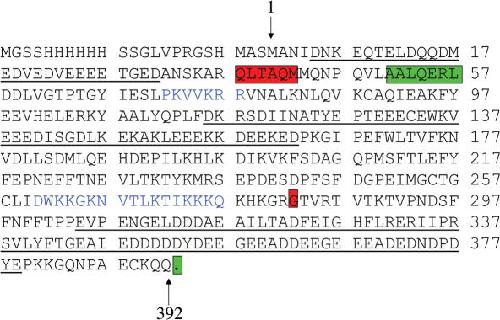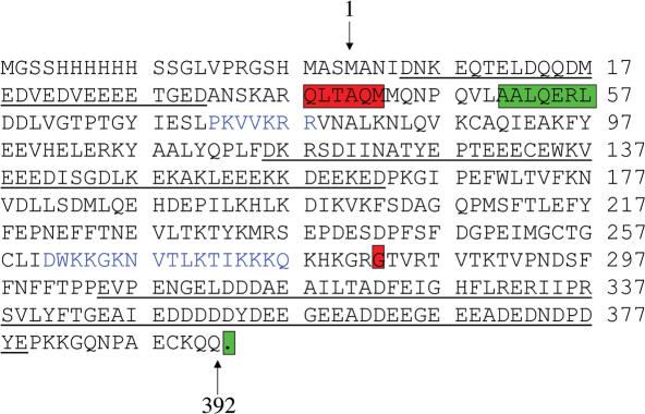 Figure 2. xNAP1 amino acid sequence showing T2 and C1 N-terminal sequences. The N-terminus of the trypsin fragment T2 (red box) and the N-terminus of chymotrypsin fragments C1 (green box) are 13 amino acids apart. The predicted C-terminus of T2 and C1 are also shown (red and green, respectively). Acidic regions are underlined and the bipartite nuclear localization signal is shown in blue. Preceding the wild-type start methionine (numbered 1) is the His-tag sequence present in the recombinant T2 protein.