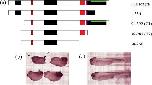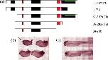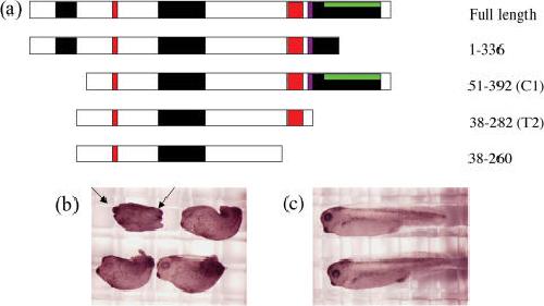 Fig 5. Injection of any of the xNAP1 constructs leads to axial defects. (a) Injected constructs are shown with conserved regions indicated. Basic regions marked by a black box, the PEST sequence is shown in green embedded in the C-terminal basic region. The NLS is marked in red and the SFFNFF shown in purple. (b) One-cell embryos were injected with 100 pg of either full-length or truncated versions of xNAP1. Un-injected embryos from the same fertilization were cultured in parallel as controls. Embryos were grown in modified bath serum at 18 until stage 36, fixed in MEMFA (0.5 M MOPS, pH 7.4, 0.5 M EGTA, 0.5 M MgSO4 and 37% formaldehyde) and stored at â20 in methanol before photographing. All forms of injected xNAP1 gave rise to a shorter A/P axis (lack of head and tail are arrowed) than the un-injected control embryos shown in (c).