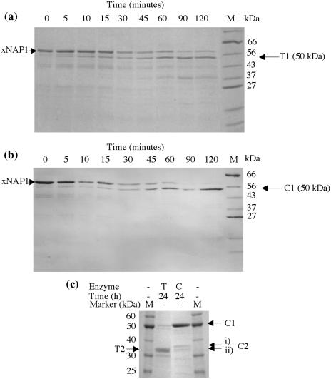 Figure 1. Limited proteolysis of xNAP1 with trypsin and α-chymotrypsin xNAP1 (0.4 mg ml−1) was digested with either trypsin (a) or α-chymotrypsin (b) at a w/w ratio of 1:10 000 enzyme to substrate. The reaction was incubated at 25°C and stopped with 1 mM PMSF and assayed by SDS–PAGE. The most distinct fragment visible after a 2 h digestion by trypsin is ∼50 kDa (T1). A 50 kDa fragment is also visible after 2 h digestion with α-chymotrypsin (C1). (c) Further digestion for a period of 24 h with trypsin and with α-chymotrypsin reveals a fragment of ∼35 kDa in the trypsin lane (T2). A 24 h digestion with α-chymotrypsin still shows a strong fragment corresponding to C1. Two smaller fragments ∼35–37 kDa in size are labelled C2 (i) and (ii).