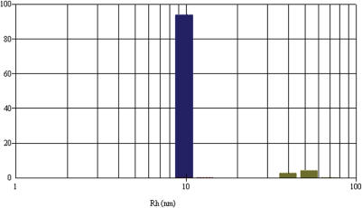 Figure 3. Dynamic light scattering of the T2 domain T2 was purified by metal chelate affinity and size exclusion chromatography. Buffers contained 10% glycerol. The T2 protein sample (0.15 mg ml−1) has one major component, comprising 93.6% (w/w) of the protein with a hydrodynamic radius of 9.6 nm.
