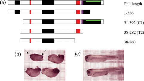 Figure 5. Injection of any of the xNAP1 constructs leads to axial defects. (a) Injected constructs are shown with conserved regions indicated. Basic regions marked by a black box, the PEST sequence is shown in green embedded in the C-terminal basic region. The NLS is marked in red and the SFFNFF shown in purple. (b) One-cell embryos were injected with 100 pg of either full-length or truncated versions of xNAP1. Un-injected embryos from the same fertilization were cultured in parallel as controls. Embryos were grown in modified bath serum at 18°C until stage 36, fixed in MEMFA (0.5 M MOPS, pH 7.4, 0.5 M EGTA, 0.5 M MgSO4 and 37% formaldehyde) and stored at −20°C in methanol before photographing. All forms of injected xNAP1 gave rise to a shorter A/P axis (lack of head and tail are arrowed) than the un-injected control embryos shown in (c).
