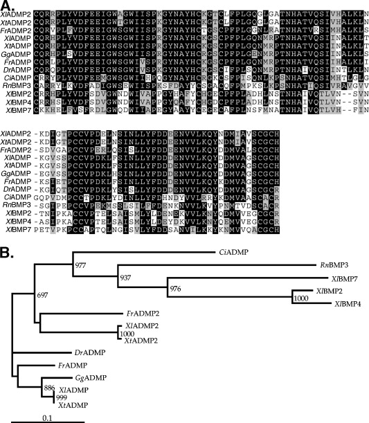 Fig. 1. The predicted ADMP2 protein. (A) Alignment of mature domain of Xenopus laevis ADMP2 (XlADMP2) with other members of the TGF-β family. (B) The schematic representation of the relationship between XlADMP2 and members of the ADMP and BMP families. The number at each branch point represents the relative incidence of that particular relationship during bootstrap resampling using 1000 replicates. The scale bar at the left bottom indicates an evolutionary distance of 0.1 amino acid substitution per position.