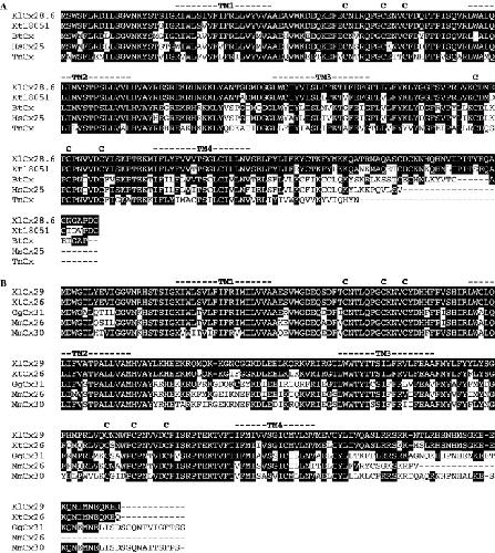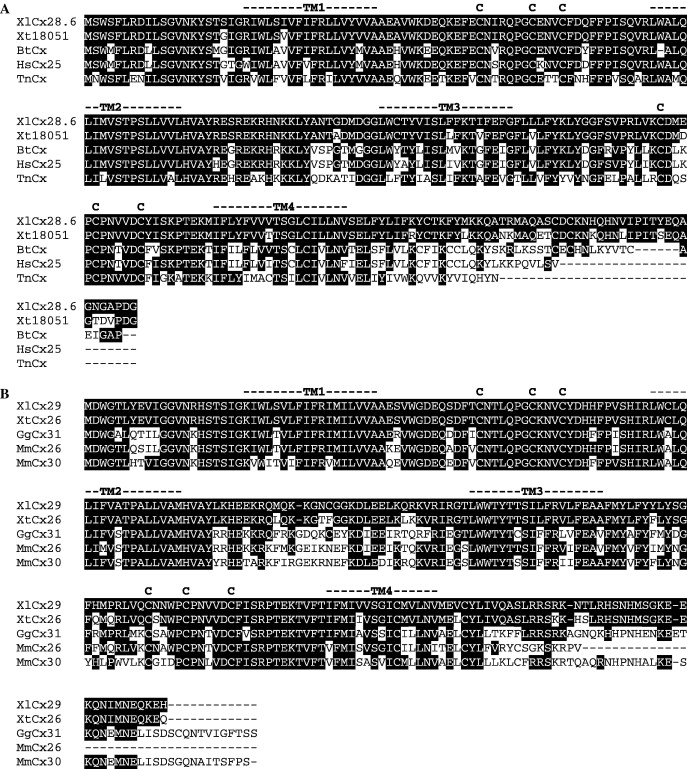 (A) Comparison of the deduced amino acid sequence of Cx28.6 with that of a presumed X. tropicalis Cx, human Cx25, and two presumed Cxs from bovine and pufferfish. (B) Comparison of the deduced amino acid sequence of Cx29 with those of X. tropicalis Cx26, mouse Cx26 and Cx30, and chicken Cx31. Putative transmembrane regions (TM1 to TM4) were predicted with the web-based program TMHMM2.0 [25] and indicated with dashed lines above the sequence. Conserved cysteine-residues within the presumed extracellular loops are indicated by a âCâ above the sequence. Identical amino acids between the Xenopus and other sequences are shaded black. Abbreviations: Bt, Bos taurus; Gg, Gallus gallus; Hs, Homo sapiens; Mm, Mus musculus; Tn, Tetraodon nigroviridis; Xl, Xenopus laevis; Xt, Xenopus tropicalis. Accession numbers and Ensembl gene identification (X. tropicalis Cx28.6 orthologue 18051) are depicted in Table 1.