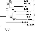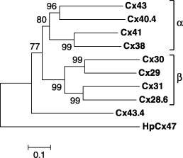 Phylogenetic tree of 9 X. laevis Cxs. Halocynthia pyriformis (sea peach) Cx47 was used as an outgroup. The open reading frame nucleotide sequences were analyzed using ClustalW method and Neighbor-Joining algorithm. Support for each node (numbers) was determined by interior-branch test. α and β indicate the two main Cx subgroups.