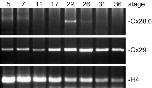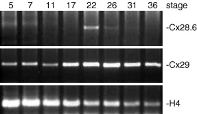 Temporal expression of Cx28.6 and Cx29. RT-PCR analysis of X. laevis total RNA at different stages of development. Note that Cx28.6 is only weakly expressed at stages 22 and 26. Nieuwkoop and Faber stages are indicated at the top. PCR with histone H4 was used as loading control.
