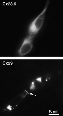 Localization of ectopically expressed Cx28.6-EGFP and Cx29-EGFP in HEK293 cells. Arrow indicates typical gap-junctional distribution of Cx29-EGFP-tagged fusion protein.