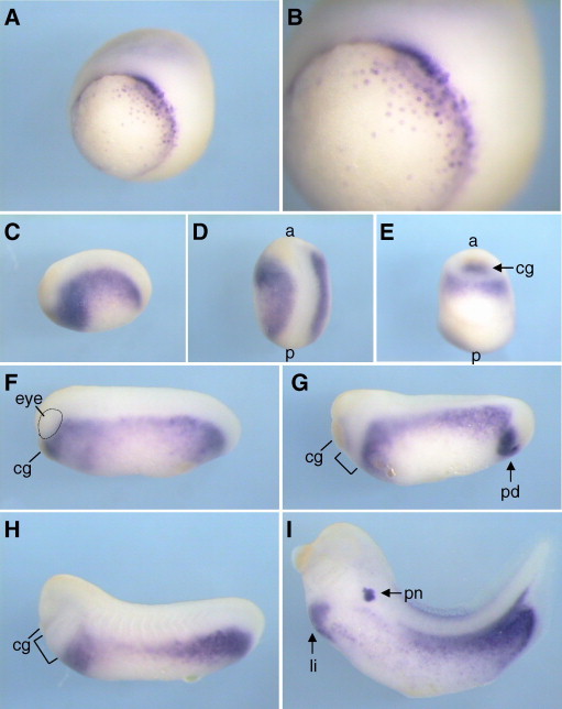 Dynamic expression of Cx29 during X. laevis development detected by whole-mount in situ hybridization. (A) Stage 10.25 embryo with dorsal side up. (B) Detail of stage 10.25 embryo shown in (A). (CâE) Stage 21 embryos with lateral view (C), dorsal view (D) and ventral view (E). Stage 25 (F), 26 (G), and 27 (H). I. Tailbud stage embryo shows specific expression in liver anlage (li) and pronephros (pn). pd, proctodeum; cg, cement gland; d, dorsal; v, ventral; a, anterior; p, posterior.