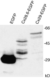 Western blot analysis of ectopically expressed Cx28.6 and Cx29. Cx28.6 (Cx28.6-EGFP) and Cx29 (Cx29-EGFP) fusion constructs were expressed in COS-7 cells. Cell lysates were analyzed for the presence of EGFP containing proteins by Western blotting using EGFP-antibody. Empty EGFP expression construct (EGFP) was used as control. Molecular weights (kDa) are indicated on the right.
