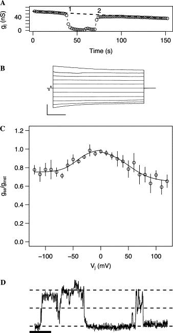 Electrophysiological characterization of Cx29 gap junction channels in N2A cells. (A) Halothane mediated reversible inhibition of gap-junctional coupling. 1, full uncoupling following Halothane application. 2, full recovery following Halothane washout. (B) Recording of junctional currents showing mild time and voltage dependent inactivation in response to transjunctional potentials ranging between â100 and +100 mV, with 20 mV steps. Vertical scale 2 nA, horizontal scale 1 s. (C) Voltage dependence of gap junctional steady-state conductance. Mean normalized steady-state conductance ± SEM (N = 7) is plotted against transjunctional potential and fitted with a two-state Boltzmann equation. (D) Representative recording of single channel activity in a poorly coupled cell pair, transjunctional potential of â70 mV. Dashed lines represent conductance states of approximately 120, 60, and 0 pS (top to bottom).