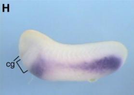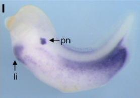 gjb2 (gap junction protein beta 2) gene expression in Xenopus laevis, via in situ hybridization, NF stage 33 and 34 embryo, lateral view, anteriorleft.