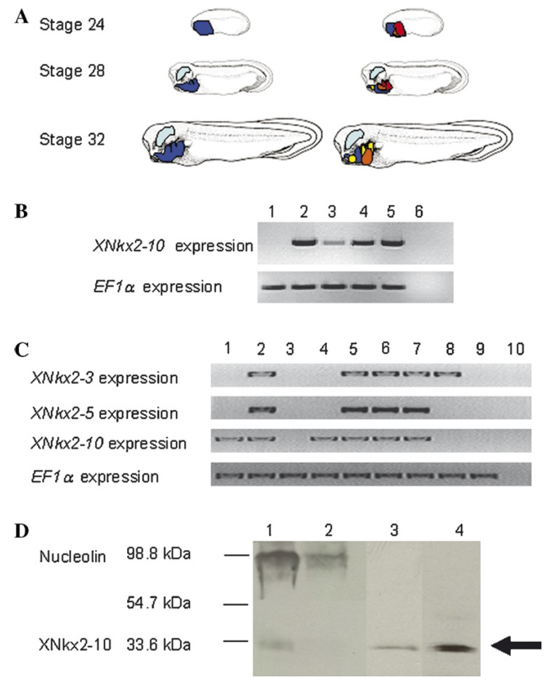 XNkx2-10 and nucleolin protein levels at stage 36. (J) Western blot demonstrating XNkx2-10 and nucleolin protein levels at stage 46. Nucleolin serves as a