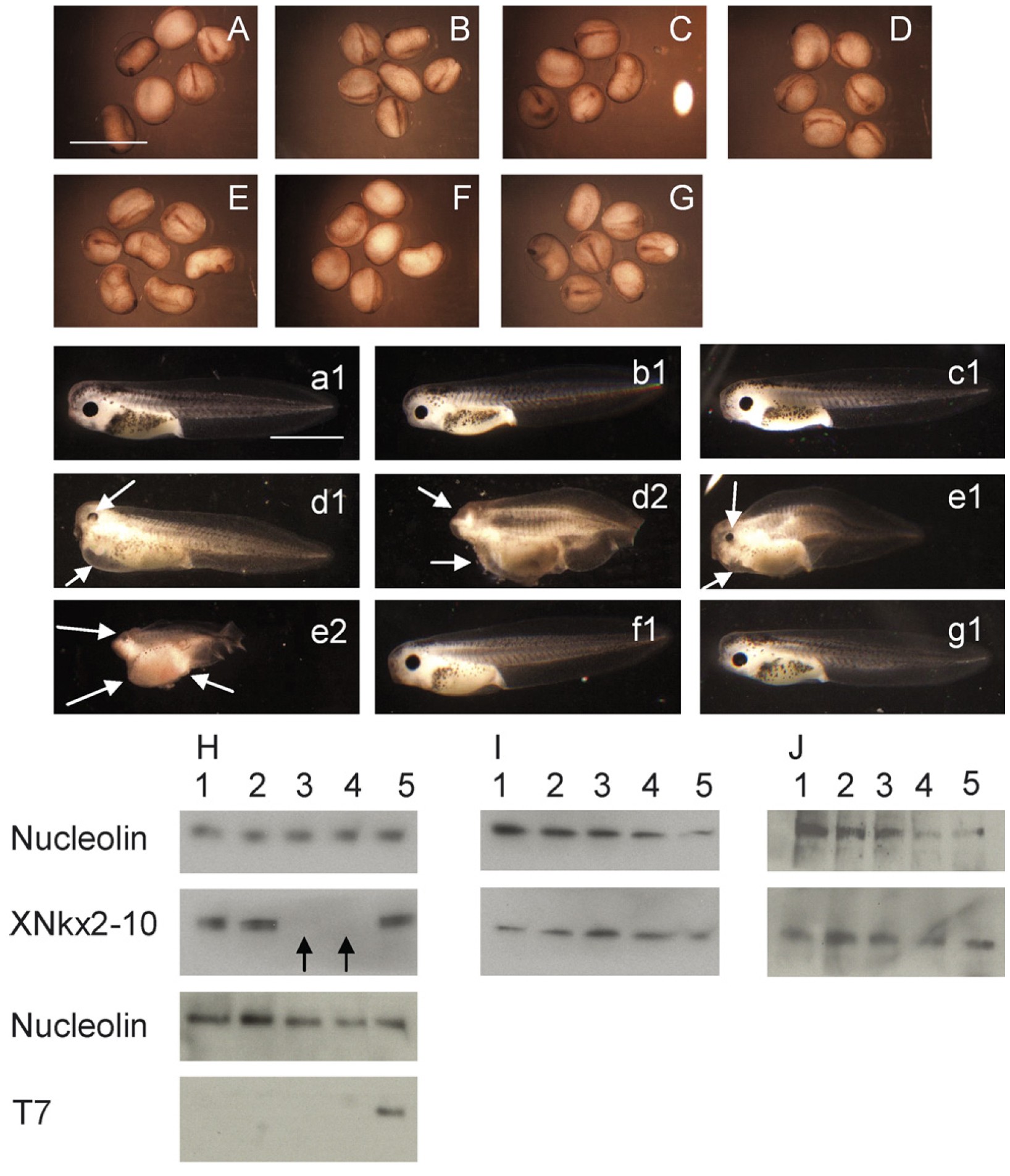 Fig. 2. Reduction of XNkx2-10 leads to abnormal development. (A�G) Pictures of stage 22 embryos. Scale bar is 3 mm. (A) are non-injected embryos. (B)