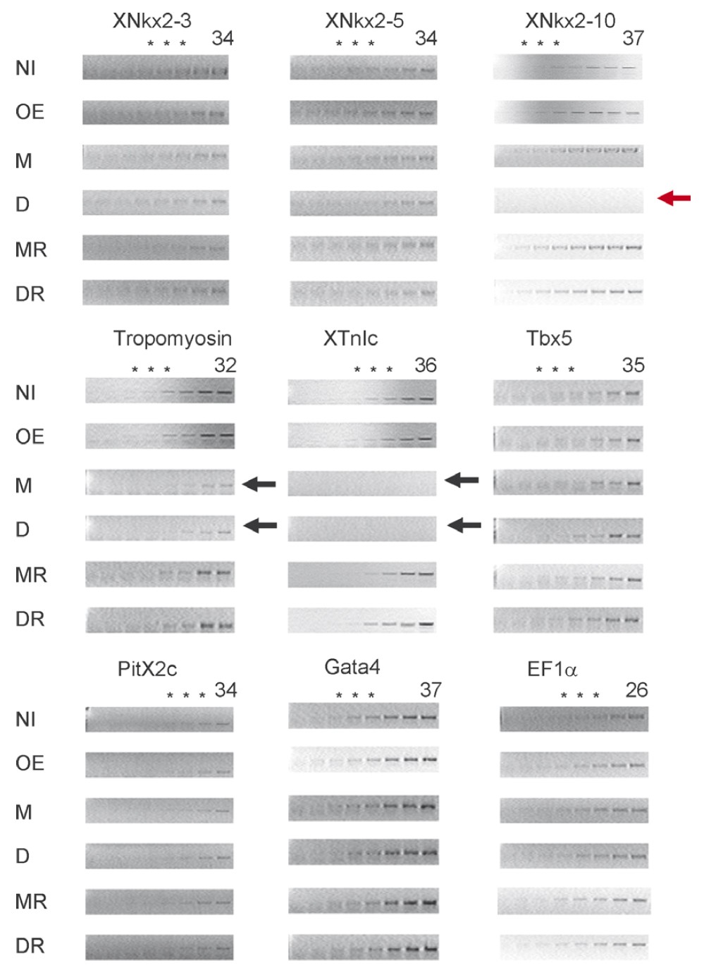 (black arrows). XNkx2-10 expression was reduced in XNkx2-10 Deed injected embryos (red arrow). The number on top of the column of gels indicates the