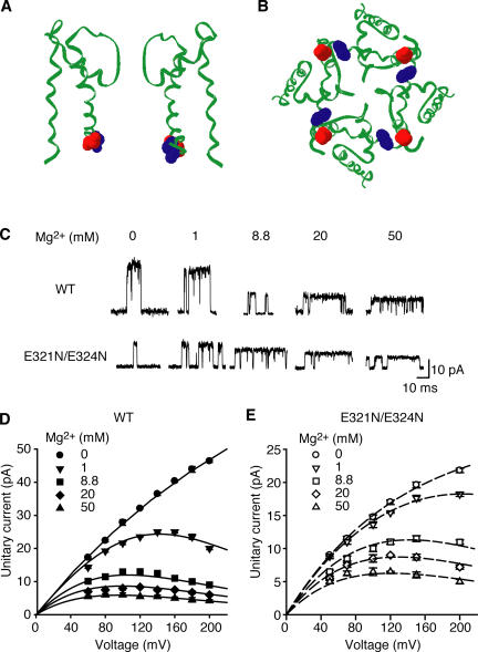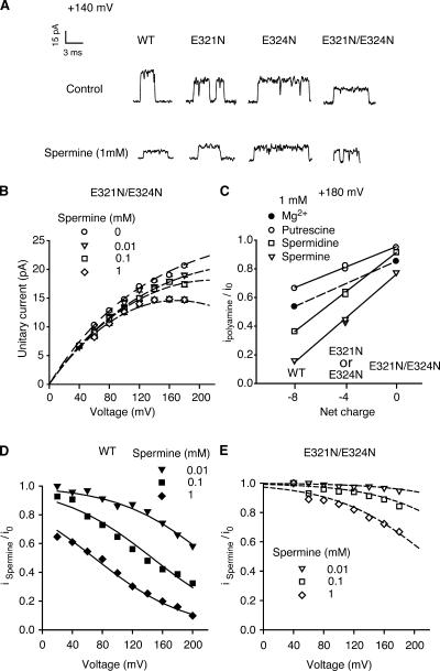 Ring of negative charge in BK channels facilitates block by intracellular Mg2+ and polyamines through electrostatics.