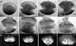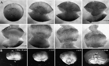 Fig. 1. Morphogenesis of the marginal zone explant. (A) An embryo at stage 10 þ is dissected in a series steps that separate the marginal zone from the rest of the embryo. Sub-blastoporal endoderm (tissues vegetal of the contracted bottle cells; dotted region) are included with this preparation. (B) Four frames from a timelapse sequence of an explant cultured for 19 h on fibronectin. The last frame shows the cement gland (arrow) forming at the animal end (an) of the anterior neural anlagen (ana). The dorsal ridge (dr) can be seen after 6 h. All views are en face with the same orientation: animal up (an), vegetal down (vg), and lateral on either side of the midline (dotted line).