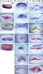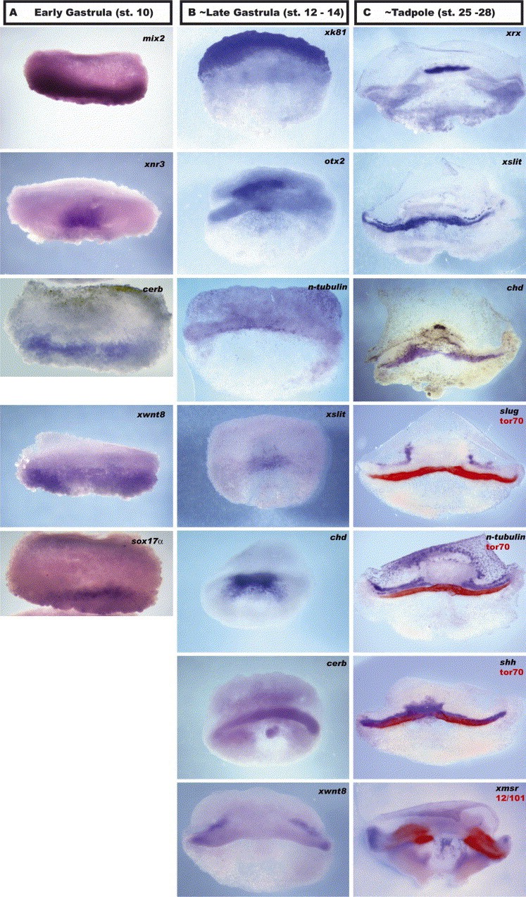 Fig. 2. Gene expression in the explant. (A) Mix2, xnr3, cerberus, xwnt8, and sox17a gene expression in explants immediately after isolation from the early gastrulaembryo. (B) Xk81, otx2, neural-specific tubulin, xslit, chordin, and xwnt8 gene expression patterns in explants cultured to the equivalent of the mid-late gastrula stage (approximately stages 12â14). (C) Xrx, xslit, chordin, slug, neural-specific tubulin, sonic hedgehog, xmsr gene expression at the equivalent tadpole stage (stages 25 â 28). Immunolocalization of tor70 (marking differentiated notochord) is shown in red accompanying slug, neural-specific tubulin, and sonic hedgehog. Immunolocalization of 12/101 (marking differentiated somitic mesoderm) is shown in red accompanying the xmsr gene expression pattern. All views are en face with the same orientation of animal up, vegetal down, and lateral on either side of the midline.