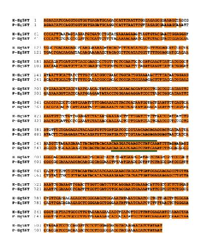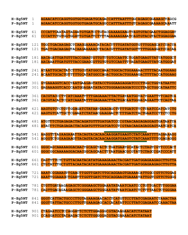 Figure 4. P-Eg5 and H-Eg5 share significant identity in their catalytic domains. A series of degenerate oligonucleotides were used to clone a segment of both the H-Eg5 and P-Eg5 cDNA by RT-PCR. (A) An alignment of P-Eg5 and H-Eg5 DNA is shown. The sequence chosen for the 21 bp siRNA is outlined in green.