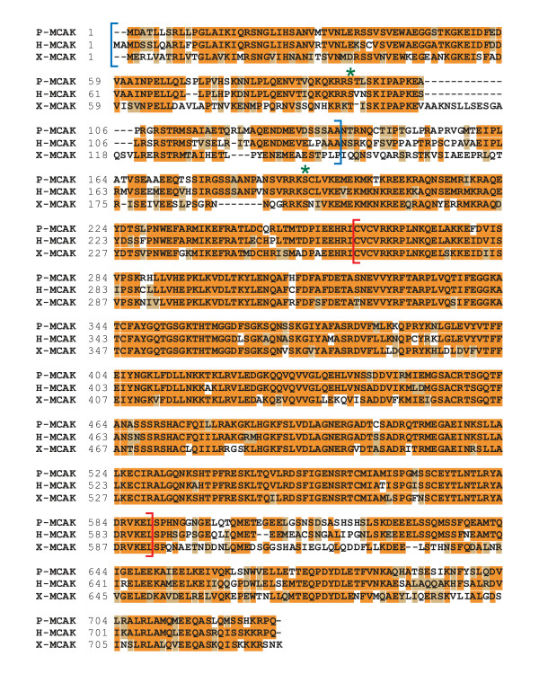 Figure 1. P-MCAK is highly similar to H-MCAK. An alignment of P-MCAK, H-MCAK and X-MCAK proteins is shown. All 3 proteins share significant identity in the N-terminal centromere targeting domain (blue brackets) and the centrally located catalytic core (red brackets). The major Aurora B phosphorylation sites that regulate centromere-targeting and microtubule depolymerization activity are also conserved and are indicated in green.