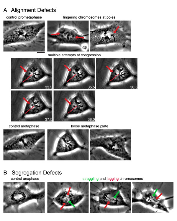 Figure 3. The congression and segregation defects scored in MCAK inhibited cells are displayed. Live imaging of RNAi knockdown and antibody inhibition of P-MCAK show an increase in congression defects, and an increase in segregation defects compared to control RNAi knockdown and IgG injected cells. (A, B) Series of panels from time-lapse phase contrast microscopy of different movies of either control or MCAK inhibited cells that illustrate the different mitotic defects that were scored in all cells. Images chosen are to represent a particular morphological defect and include images taken from both antibody injection experiments and RNAi experiments. (A) Alignment defects and (B) segregation defects. In each panel, the arrow points to the chromosome of interest, and the line indicates the trajectory of chromosome movement and can serve as a reference point for the extent of chromosome movement. Scale bar, 10 μm.