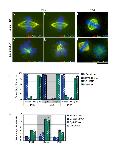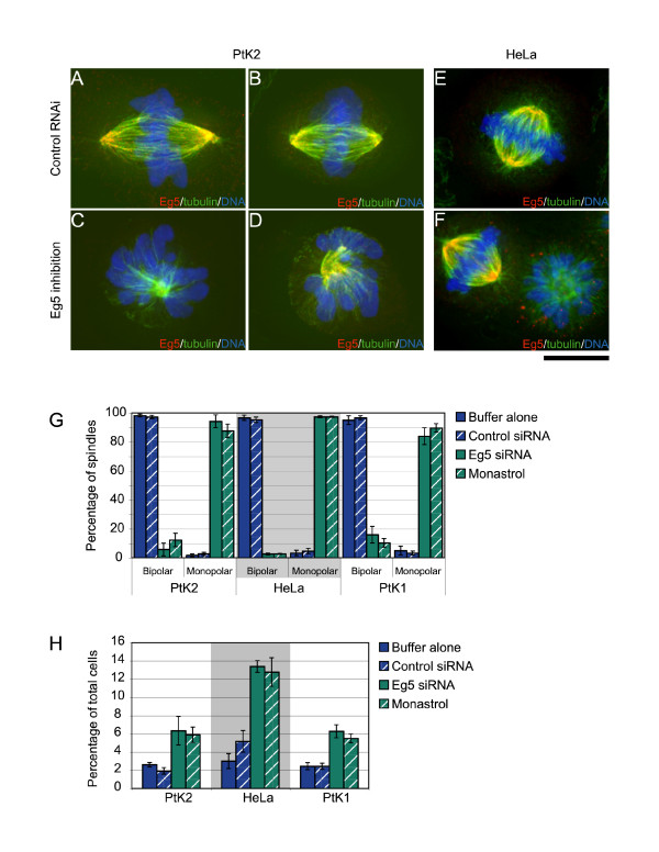 Figure 5. Knockdown of Eg5 causes an increase in monopolar spindles. Either PtK2 (A, B, C, D) or HeLa (E, F) cells were transfected with the identical 21 bp siRNA to knockdown Eg5 levels. (A, B, E) Control cells stained to visualize microtubules (green), Eg5 (red) and DNA (blue). Eg5 knockdown cells (C, F) or cells that were treated with the Eg5 inhibitor monastrol (D) were stained to visualize microtubules (green), Eg5 (red) and DNA (blue). Knockdown of Eg5 levels resulted in cells with monopolar spindles and a mitotic delay as reported previously. (G) Quantification of the percentage of RNAi cells with bipolar versus monopolar spindles in either buffer, negative control siRNA, Eg5 siRNA, or monastrol treated cells for PtK2, HeLa and PtK1 cell lines. (H) Quantification of the mitotic index in PtK2, HeLa, and PtK1 cells transfected with buffer, control siRNA, or Eg5 siRNA, or treated with monastrol. All data represent mean +/- SEM for 3+ experiments. N = 600 cells for mitotic index and N = 100 cells for mitotic phenotype counts for each experiment. Scale bar, 10 μm.